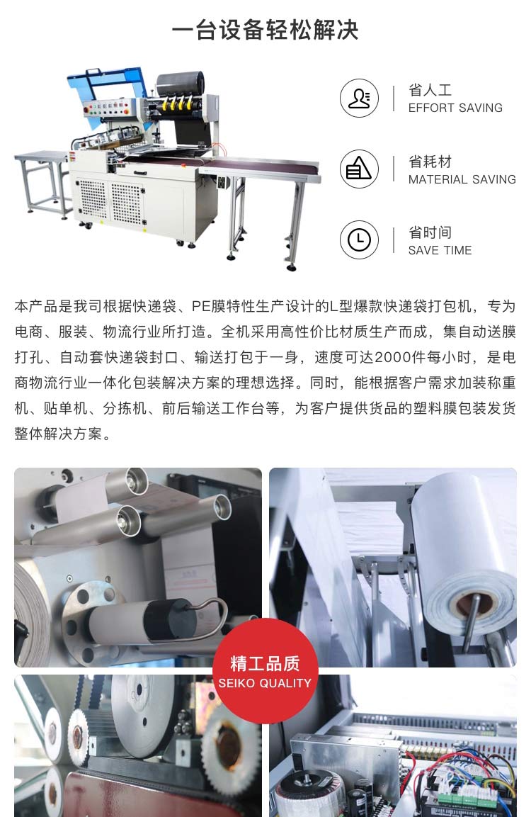 介紹:本產品是我司根據快遞袋、PE膜特性生產設計的L型快遞袋打包機,專為電商、服裝、物流行業所打造。全機采用高性價比材質生產而成,集自動送膜打孔、自動套快遞袋封口、輸送打包于一身,速度可達2000件每小時,是電商物流行業一體化包裝解決方案的理想選擇。同時,能根據客戶需求加裝稱重機、貼單機、分揀機、前后輸送工作臺等,為客戶提供貨品的塑料膜包裝發貨整體解決方案。